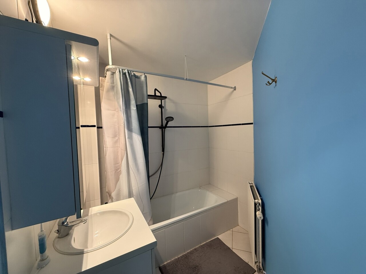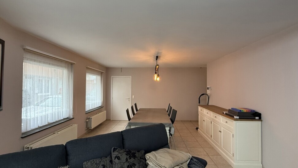 Inkomhal, open vestiaire, toilet, living, ingerichte keuken ( kasten, dampkap, koelkast, oven, vitro keramische kookplaat), ingerichte badkamer (ligbad, lavabomeubel) , 1 slaapkamer, terras, rechtstreekse toegang tot garage, gelijkvloerse berging.