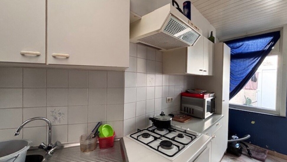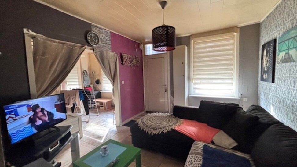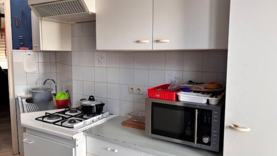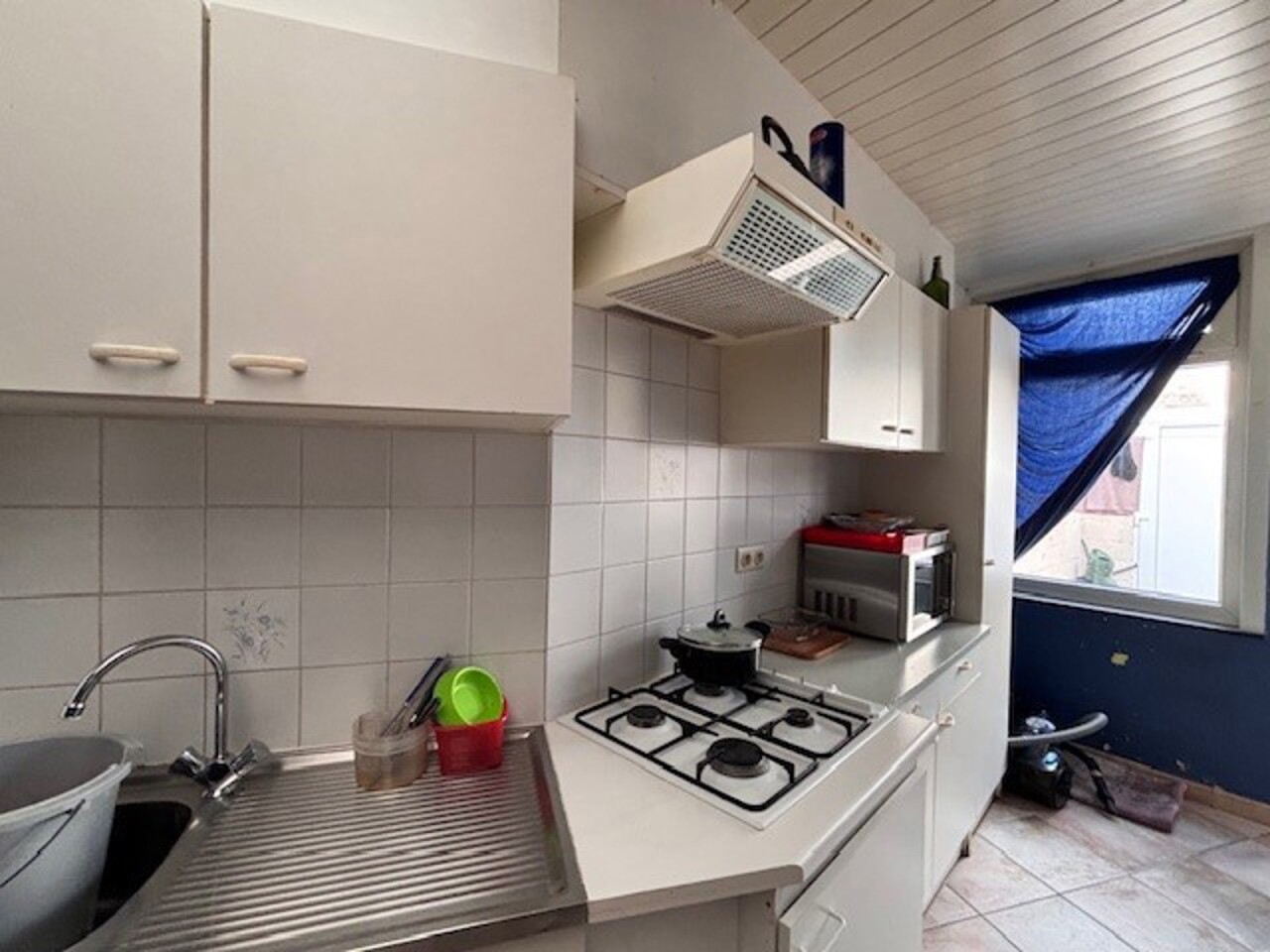 GELIJKVLOERS: living met zithoek en eetplaats, een praktische keuken (oa kaste, fornuis, spoelbak...), een badkamer en een achterliggende berging.