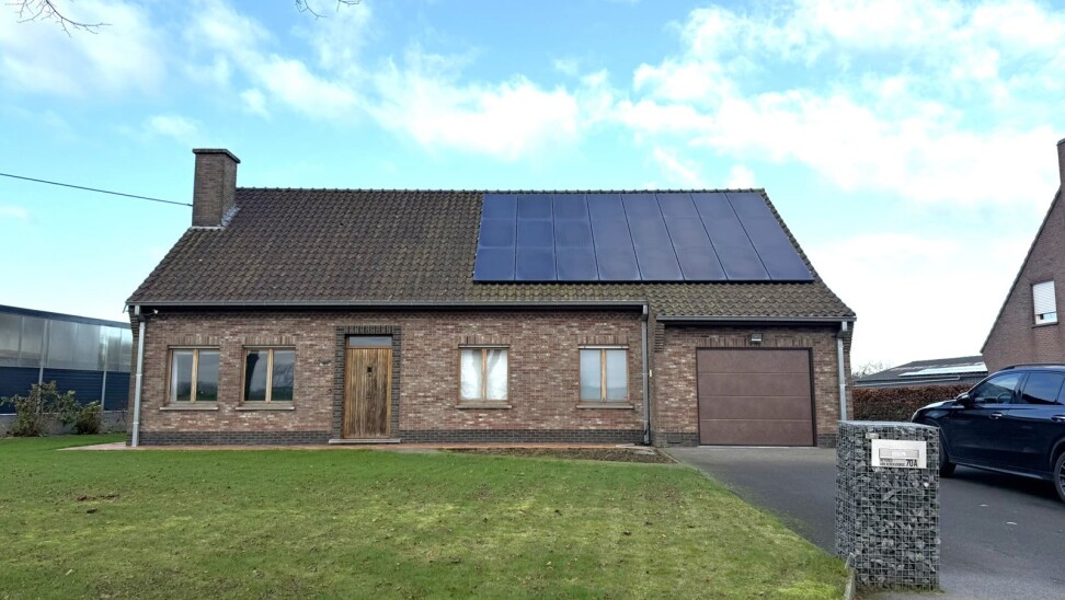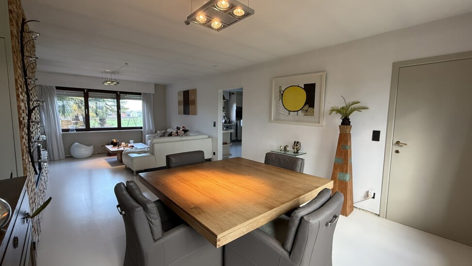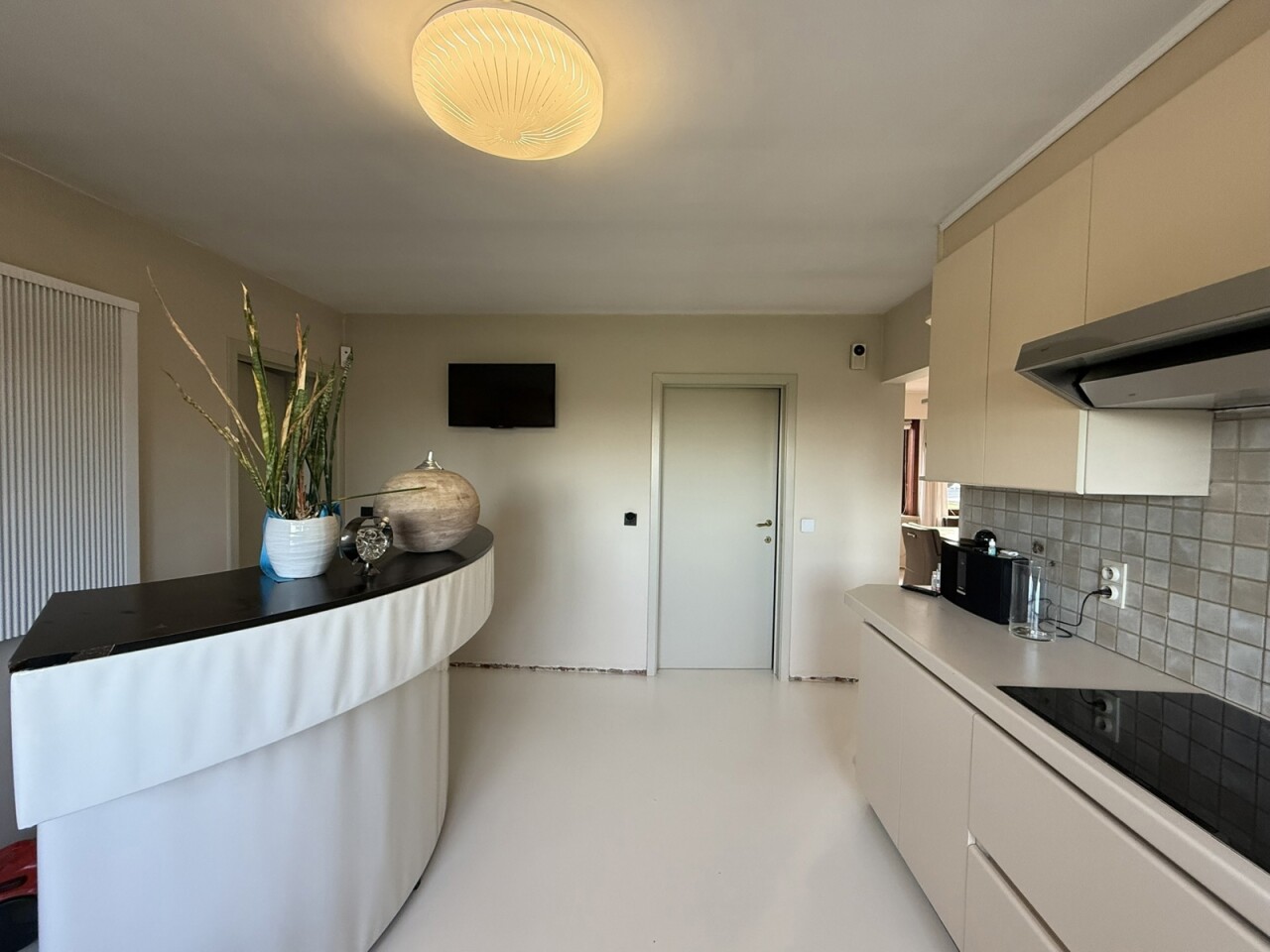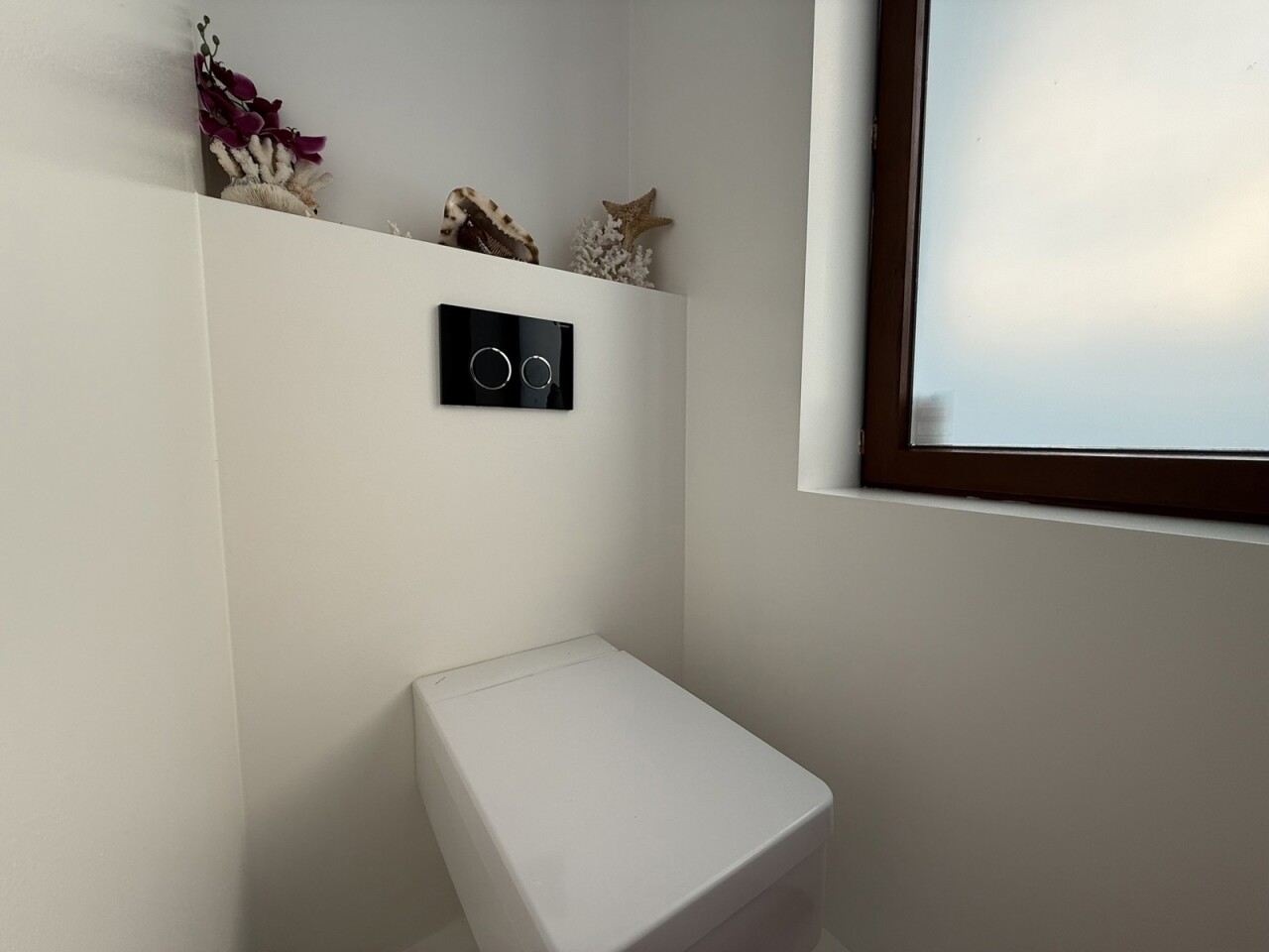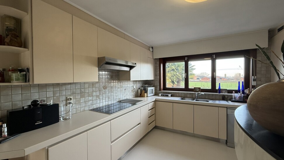 In de inkomhal kom je binnen in een ruime leefruimte met zithoek en eetplaats. De volledig ingerichte keuken is uitgerust met kasten, inductiekookplaat, oven, koelkast, vaatwasser en dampkap. Aansluitend vind je een handige voorraadruimte. Vanuit de keuken heb je ook toegang tot een berging met toilet en plaats voor een diepvries.