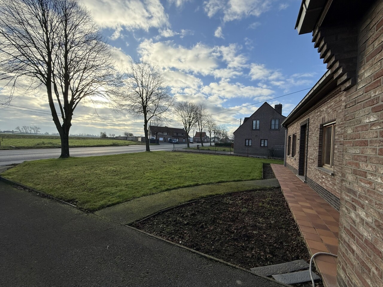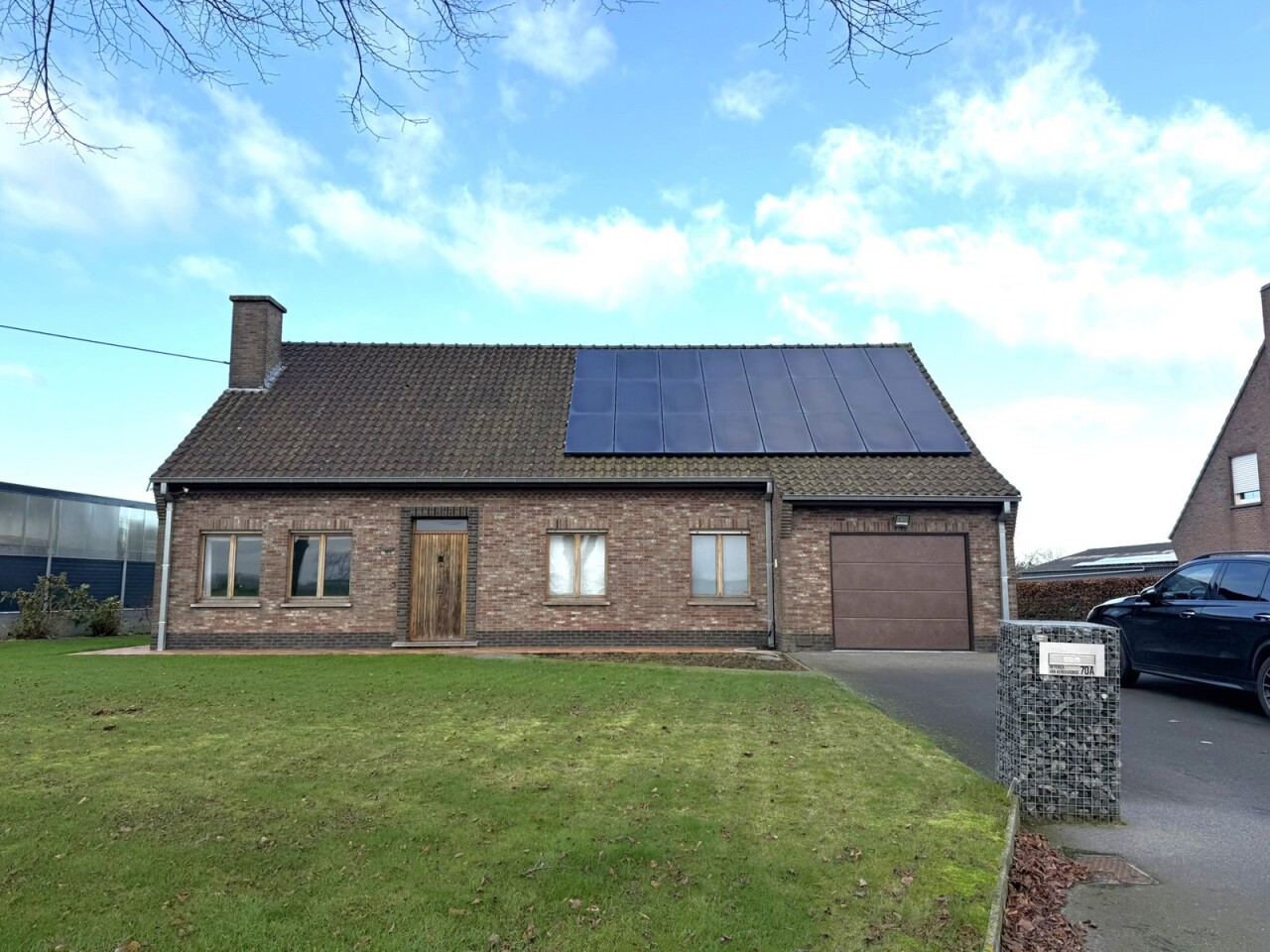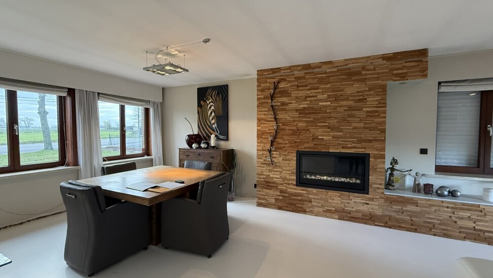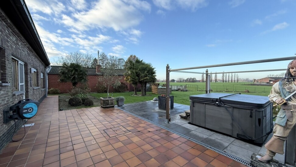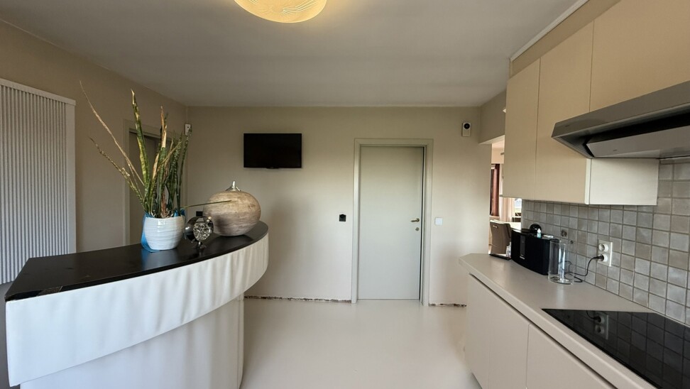 In de inkomhal kom je binnen in een ruime leefruimte met zithoek en eetplaats. De volledig ingerichte keuken is uitgerust met kasten, inductiekookplaat, oven, koelkast, vaatwasser en dampkap. Aansluitend vind je een handige voorraadruimte. Vanuit de keuken heb je ook toegang tot een berging met toilet en plaats voor een diepvries.